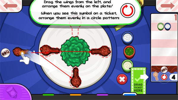 3、将食材从左侧拖至餐盘,按要求均匀排列,若票据有对应标识,需将食材以圆形图案均匀摆放。
