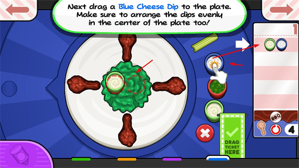 4、拖动蘸料至餐盘,同时确保蘸料在餐盘中心区域均匀分布,完成美食搭配。