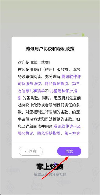 1、在腾讯用户协议和隐私政策弹窗中点击同意按钮,进入登录选择页面。