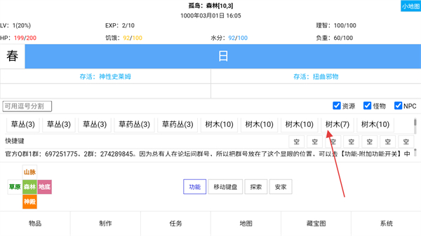 1、点击界面中的探索区域,前往对应场景采集资源,获取草丛、树木等物资,积累生存材料。