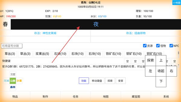 3、场景时间切换为夜,点击方向键移动位置,前往新区域探索,获取石块、矿石等新资源。
