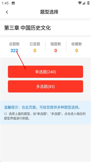 3、在题型选择页面,点击单选题选项,进入该章节的单选题作答页面。