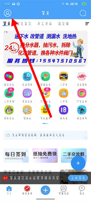 1、打开通辽团,点击左上角头像图标,进入我的页面。