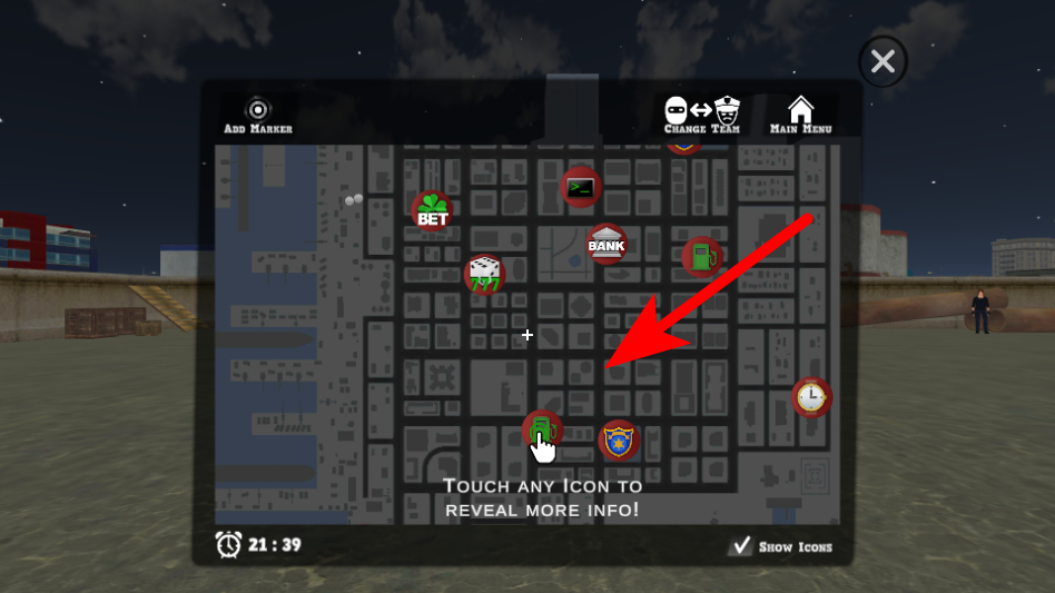 3、在展开的地图界面,点击任意图标可查看对应地点如银行、商店的详细信息,辅助规划行动路线。