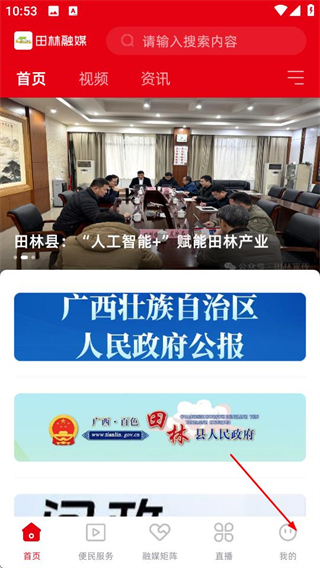 1、在田林融媒首页,点击底部的我的选项,进入个人中心页面。