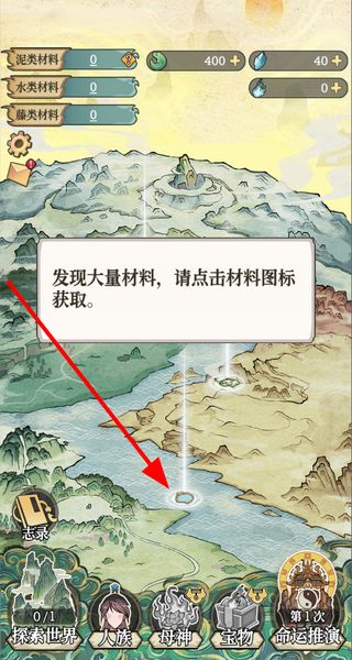 1、探索界面发现材料提示后,点击材料图标获取材料,不同区域会出现不同类型的材料,收集后可用于后续操作。