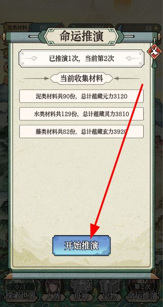 2、进入命运推演界面,确认已收集的材料数量后,点击开始推演按钮,消耗材料进行推演,推进游戏进程。