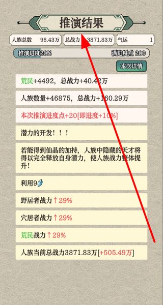 3、推演结束后查看推演结果,会显示人族数量战力等属性的变化,还有推演进度的提升,以及各类战力加成效果。