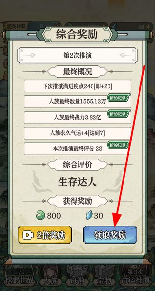 4、推演完成后进入奖励界面,查看本次推演的最终概况,点击领取奖励获取资源奖励,也可选择2倍奖励获取更多资源。