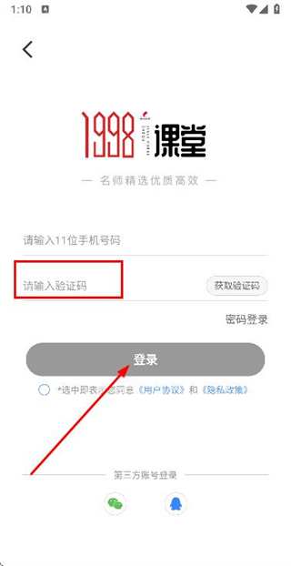 3、在验证码输入框中填写收到的验证码,点击登录完成账号的登录操作。