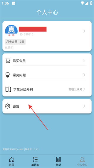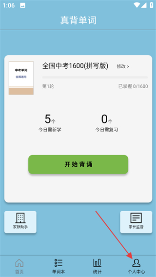 1、在真背单词首页,点击底部的个人中心选项,进入个人中心页面。