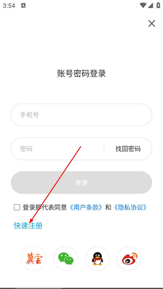 3、在账号密码登录页面,点击快速注册的选项,即可进入注册页面。