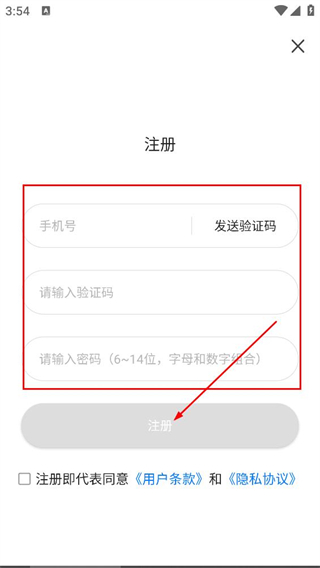 4、在注册页面,填写手机号和验证码,设置密码,点击注册完成账号注册。