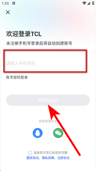 3、在欢迎登录TCL页面,输入手机号码,勾选协议后,点击获取验证码。
