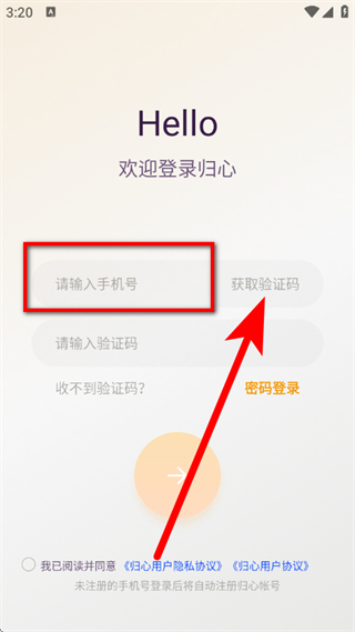 2、在登录页面,输入手机号,点击获取验证码。