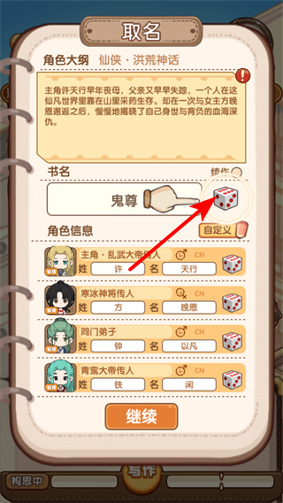 3、在取名界面,点击骰子按钮可随机生成书名或角色信息,确定内容后点击继续,即可推进小说创作的下一步。