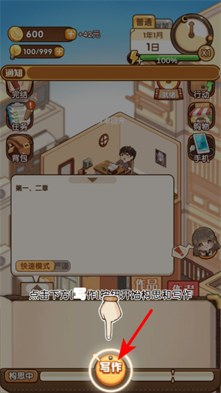 非传统放置挂机玩法,以通关为核心驱动,每一步操作都有实际意义,需规划资金使用(如先赚钱付房租)、优化题材搭配提升作品评分。