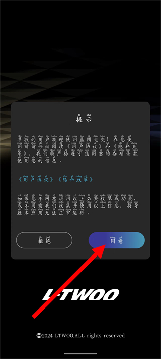 1、打开蓝图电变,在弹出的隐私政策相关弹窗中,点击同意。