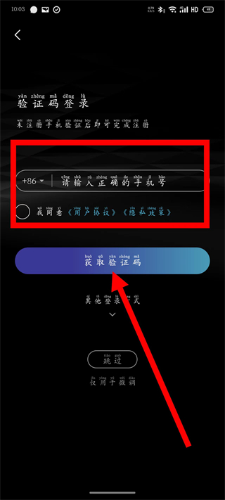 3、在验证码登录页面,输入正确的手机号,勾选后,点击获取验证码。