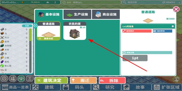 1、建筑界面选择基础设施里的建筑,查看其信息后点击建筑决定,消耗资源在地图上布置建筑,提升城镇点数。