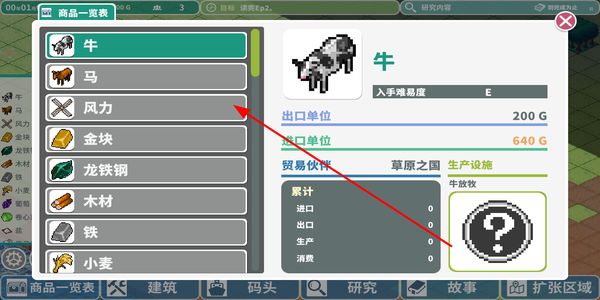 3、打开商品一览表,查看各类商品的进出口价格和贸易伙伴,了解商品的入手难度,为后续贸易活动做准备。