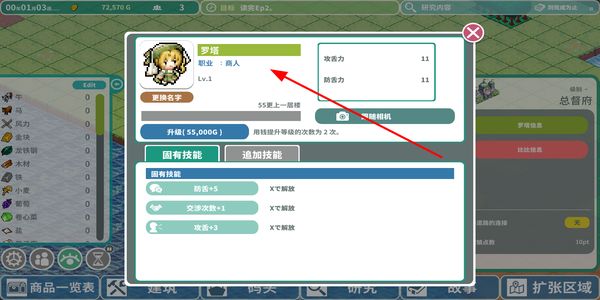 4、查看角色信息,消耗金币提升角色等级,解锁其固有技能,增强角色的攻舌和防舌能力,助力贸易交涉。