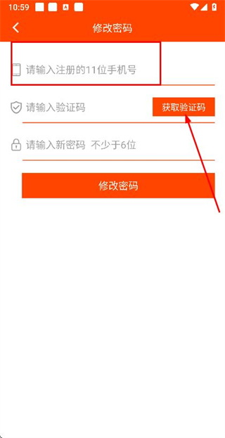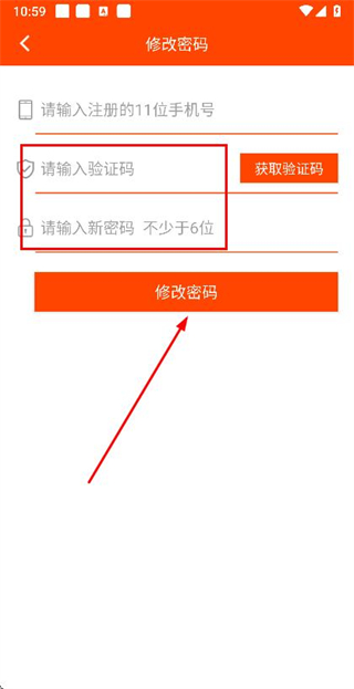 3、在修改密码页面填写验证码和密码后,点击修改密码完成操作。