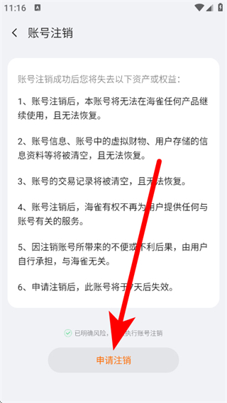 5、在账号注销页面,勾选协议,点击申请注销,完成账号注销。