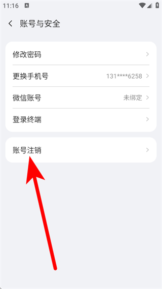 4、在账号与安全页面,点击账号注销,进入账号注销页面。