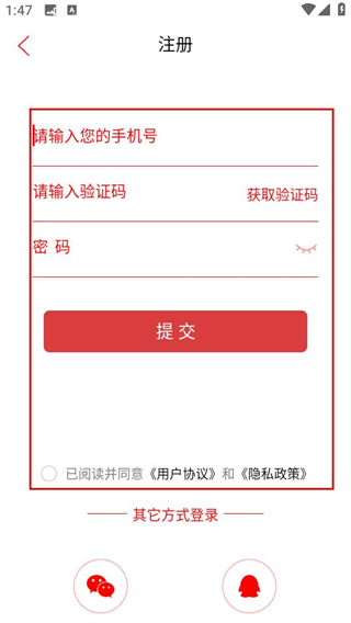 4、在注册页面,填写信息并勾选协议后,点击提交完成账号注册。