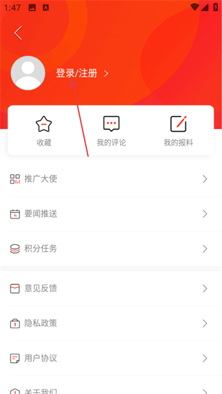 2、在个人中心页面,点击登录注册选项,进入登录页面。