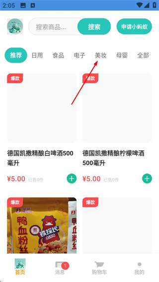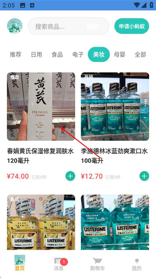 1、在小蚂蚁购物首页,点击美妆分类标签,进入美妆商品列表页面。