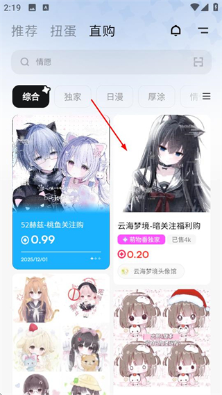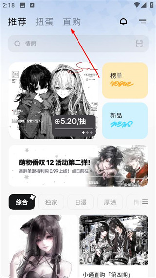1、在萌物番首页,点击顶部的直购选项,进入直购商品列表页面。