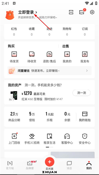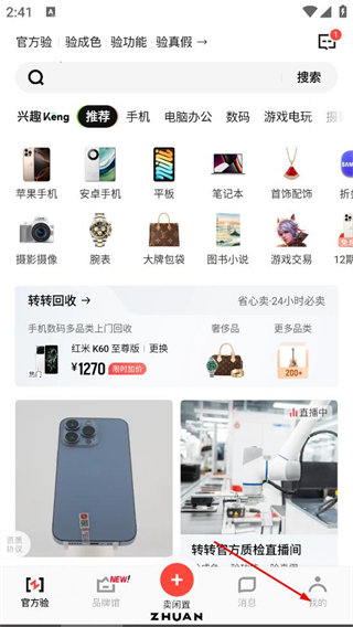 2、在转转首页,点击底部的我的选项,进入个人页面。