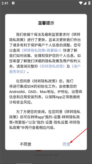 1、在转转的温馨提示弹窗中,点击同意,进入应用首页。