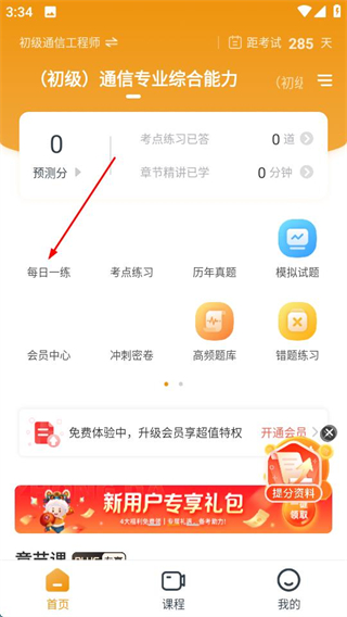 1、在建筑工程准题库首页,点击每日一练选项,进入每日一练页面。