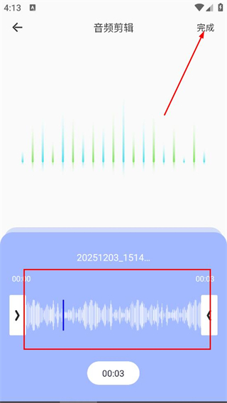 3、在拖动剪辑区域的滑块调整想要保留的音频片段范围,点击右上角的完成,完成音频剪辑操作。