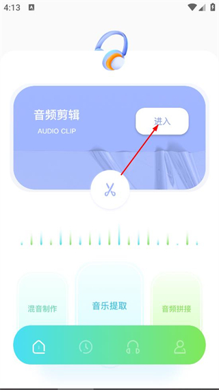 1、在音频首页,点击音频剪辑模块右侧的进入,进入选择音乐页面。