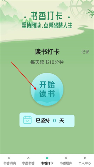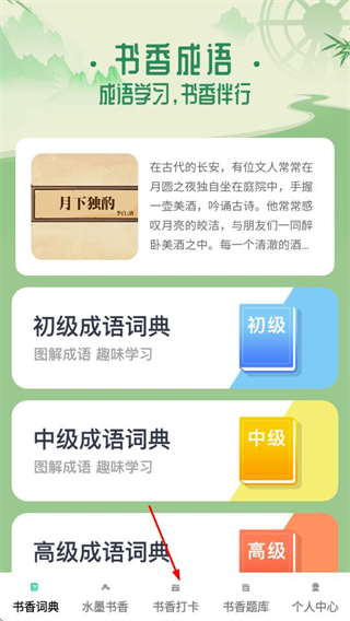 1、在书香成语首页,点击底部的书香打卡选项,进入读书打卡页面。