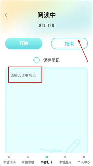 3、在阅读页面,可输入笔记后点击结束按钮,完成本次读书打卡。