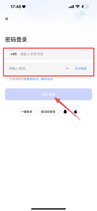 4、在密码登录界面,填写手机号码和密码,点击登录,完成账号登录。