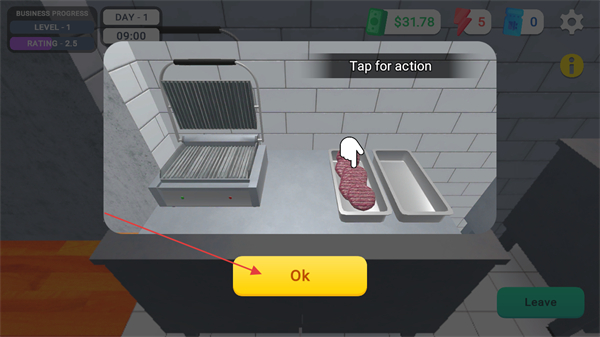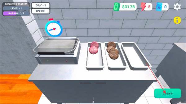4、肉饼煎制完成后,点击红色箭头所指的Leave按钮,离开当前区域,继续后续的餐品制作流程。