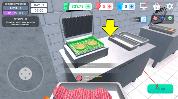 2、遵循教程的提示煎制肉饼,点击红色箭头所指的Fillup按钮,将肉饼放置到烤架上开始煎制。