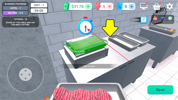 3、待烤架上方的时间显示完成加热后,点击Open按钮,操作烤架以完成肉饼的煎制步骤。