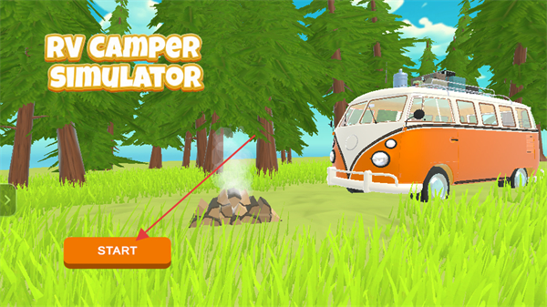 1、进入RVCamperSimulator的启动界面,点击橙色的START按钮,即可进入包含房车、篝火元素的露营游戏场景,开启房车露营的模拟体验。