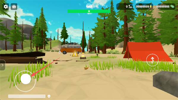 2、进入游戏场景后,通过左下角的控制按钮操控角色移动,在涵盖房车、帐篷的露营区域内探索,完成露营相关的模拟操作,推进游戏流程。