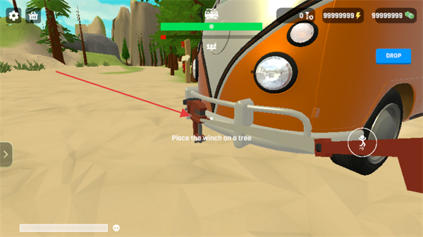 4、根据游戏提示Placethewinchonatree,操作将绞盘放置到树上,完成该装备布置类任务,这是露营模拟中的操作环节,完成后推进游戏进度。