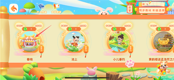 2、在古诗选择页面,点击春晓对应的学习入口,进入该古诗的互动学习页面。
