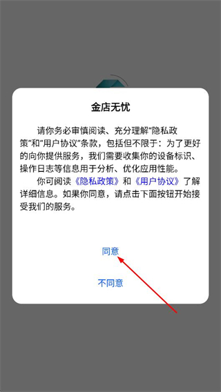 1、在金店无忧的隐私政策与用户协议弹窗中,点击同意,进入登录页面。