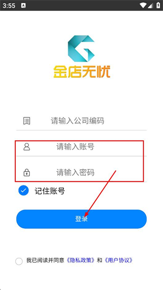 3、在登录页面,继续填写账号、密码,点击登录,完成金店无忧的账号登录。